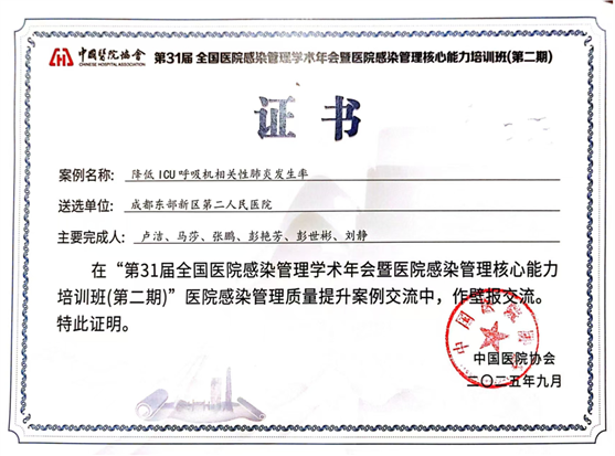 此次获奖,既是对成都东部新区第二人民医院感控团队专业能力的认可,也展现了我院在感染防控领域的实践成效。院感团队将以此为契机,继续优化多科协作流程,推进智能化监测工具在临床中的应用,重点加强手卫生依从性管理、环境消毒质量监测等基础环节,通过数据驱动的科学管理持续提升防控水平,为保障患者安全、促进区域感控工作规范化建设提供可参考的经验。(张 鹏)