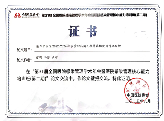 成都东部新区第二人民医院感科提交科研论文《某二甲医院2022-2024年多重耐药菌及抗菌药物使用情况分析》,通过回顾性研究,结合多重耐药菌检出情况、抗菌药物使用情况与药敏结果,以趋势性检验和相关性分析的方式,揭示了MDRO传播与抗菌药物使用强度的动态关联及耐药基因水平转移机制,为基层医疗机构建立抗菌药物精准管控与多耐菌传播预警体系作出一定贡献。经过激烈的竞争与专家严格评审,该投稿论文从375个投稿论文中脱颖而出,成功入选并以“壁报交流”形式与全国各地学者分享。这一荣誉不仅是对基层医院感染防控科研能力的重要肯定,更是多重耐药菌精准防控策略实践应用的成功范例。