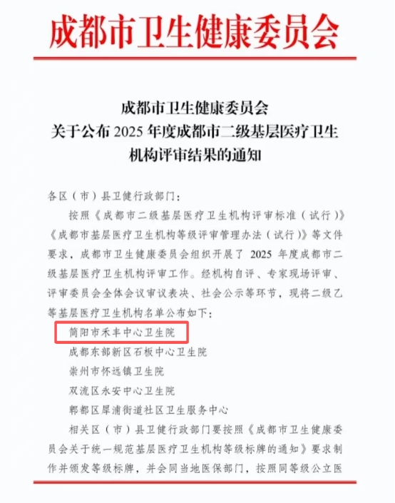 在成都市卫生健康委员会组织的2025年度二级基层医疗卫生机构评审中,简阳市禾丰中心卫生院顺利通过成都市二级乙等基层医疗卫生机构评审!